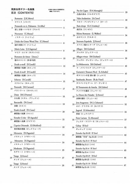 ロマンス(メルツ)/悲しき歌~ハバネラ(アルバ)/ノクターン(ヘンツェ)/緑の木陰にて(ヘンツェ)/マリア・ルイサ(サグレラス)/愛のロマンス(作者不詳)/練習曲イ短調(カルッリ)/練習曲ニ短調(カルッリ)/スケルツォ(カルッリ)/パストラーレ(カルカッシ)/ひな菊(プラッテン夫人)/舟歌(コスト)/練習曲ニ短調(コスト)/練習曲ト長調(アグアド)/東洋風狂想曲(ビックフォード)/2つのメヌエット(パガニーニ)/モデラート(パガニーニ)/2つのタンゴ(フェレール)/白鳥の歩み(マルサグリア)/ワルツ・アンダンティーノ(カーノ)/雨だれ(リンゼイ)/小ロマンス(ワルカー)/スペイン風セレナーデ(フェレール)/アレグロ(ジュリアーニ)/アレグロ・ヴィヴァーチェ(ジュリアーニ)/ラ・メランコニア(ジュリアーニ)/ギタリストの宝(シュルツ)/サラバンドとブーレ(ド・ヴィゼー)/アメリアの遺言(リョベート)/水神の踊り(フェレール)/ホタ・アラゴネーサ(カバナリ)/青春(シュナイダー)/フェステ・ラリアーネ(モツァーニ)/ギャロップ(ソル)/練習曲“月光”Op.35-22(ソル)/練習曲Op.31-3(ソル)/練習曲Op.31-4(ソル)/練習曲Op.60-25(ソル)/練習曲Op.31-10(ソル)/メヌエットOp.11-5(ソル)/メヌエットOp.11-6(ソル)/メヌエットOp.25(ソル)/ワルツOp.32-2(ソル)/ラ・マズルカ(レニャーニ)/序曲(カルッリ)/ロマンス(パガニーニ)/ピカピカ(作者不詳)/ショーロ(ペルナンブコ)/パバーナ(サンス)/2つのメヌエット(ラモー)/牝牛の番をしての主題による変奏曲(ナルバエス)/リュートのための6つの小品(作者不詳)/ファンタジー(ヴァイス)/プレリュード(ポンセ)/バレット(ポンセ)/ジーグ(ヴァイス~ポンセ)/プレリュード(バッハ)/ブーレ(バッハ)/サラバンドとドゥーブル(バッハ)/フーガ(バッハ)/サラバンド(ヘンデル)/ヘンデルの主題による変奏曲(ジュリアーニ)/マルボローの主題による変奏曲Op.28(ソル)/魔笛の主題による変奏曲Op.9(ソル)/独創的幻想曲(ビーニャス)/プレリュード第7番(ショパン~タレガ)/ヴェニスの舟唄(メンデルスゾーン~タレガ)/ラグリマ(タレガ)/アデリータ(タレガ)/エンデチャとオレムス(タレガ)/夢~マズルカ(タレガ)/タンゴ(タレガ)/ワルツ(タレガ)/アラビア風綺想曲(タレガ)/アランブラの想い出(タレガ)/スペイン舞曲第5番(グラナドス)/入江のざわめき(アルベニス)/マジョルカ(アルベニス)/セビーリャ(アルベニス)/アストゥリアス(アルベニス)